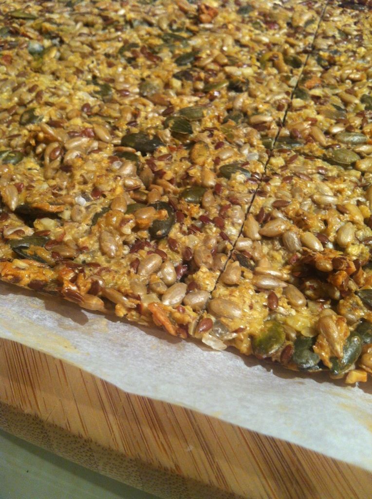 Levitä taikina uunipellille ja laita uuniin 150 asteeseen 20-30 minuutiksi. Leikkaa paloiksi heti uunista ottamisen jälkeen.